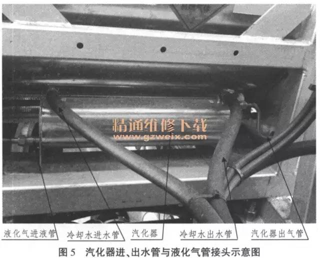 汽化器进液管、出气管与汽化器进、出水管正确的管路走向应为:从气瓶到汽化器进液体端与汽化器进水端同向,汽化器出气端应当与汽化器出水端同向(见图5)。