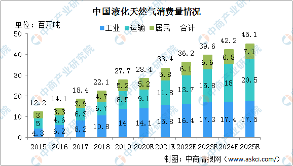 中国液化天然气消费量由2015年的12.2百万吨增至2019年的27.7百万吨,复合年增长率为22.7%。受到鼓励使用以液化天然气动力汽车及以煤改气的促进的有利政策出台的影响,液化天然气的消费在过去五年中一直保持较高的增速。受新冠肺炎疫情疫情所影响,预计2020年中国液化天然气消费量的增速放缓。鉴于液化天然气在能源业的战略重要性,以及刺激消费量的一系列全国政策,液化天然气消费量预计于2020年下半年逐步恢复,预计2025年液化天然气消费量将达45.1百万吨。