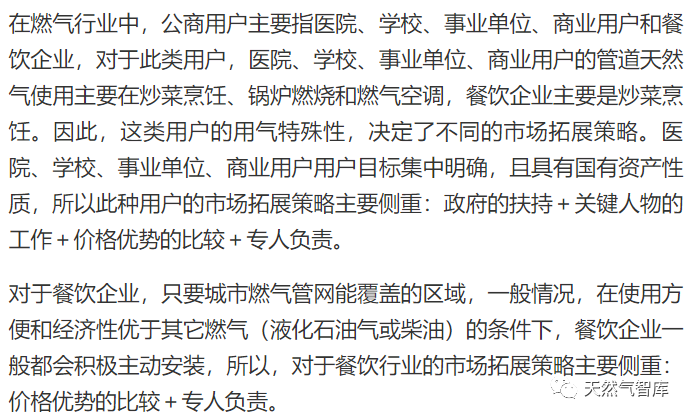 由于工业用户用气量巨大,此类特殊用户需要专门的小组来进行合作商谈,工业用户主要分为天然气发电和天然气化工生产,此类用户属大型特殊用户,必须单独区别对待,比如,一个装机容量60万KW.时天然气发电厂,年发电40亿度,按热电联供方式进行生产,效率按0.3方天然气发1度电算,一天发电18小时,一年的天然气将达11.8亿,所以,必须成立专门的项目小组进行前期运作,并取得政府的大力支持。因此,此类用户的市场拓展策略主要侧重:政府引导+项目小组+专人负责。