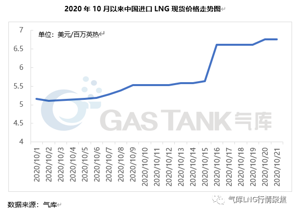 10月以来尤其是近两周,受欧洲NBP涨价带动,下游看好未来市场,对冬季的预期需求比较高心态支持下,亚洲液化天然气现货价格大幅上调,本周升至10月来最高水平6.75美元/百万英热。